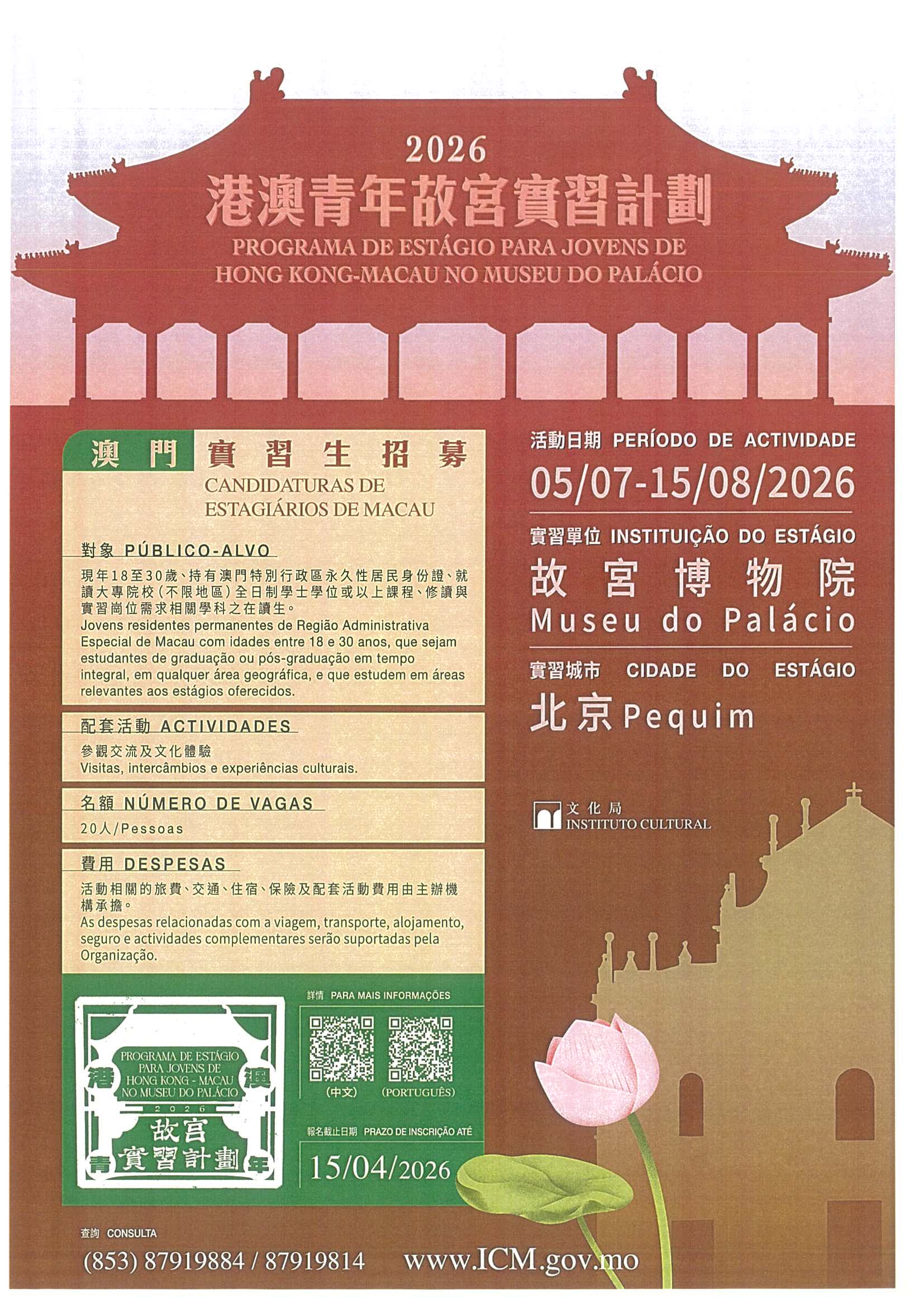 為提高澳門青年專業技能,加強對國家與中華文化的認識,深化愛國愛澳情懷,現誠邀符合資格的本校學生參加由澳門特別行政區政府文化局、香港特別行政區政府民政及青年事務局、故宮博物院合辦之「港澳青年故宮實習計劃2026」。