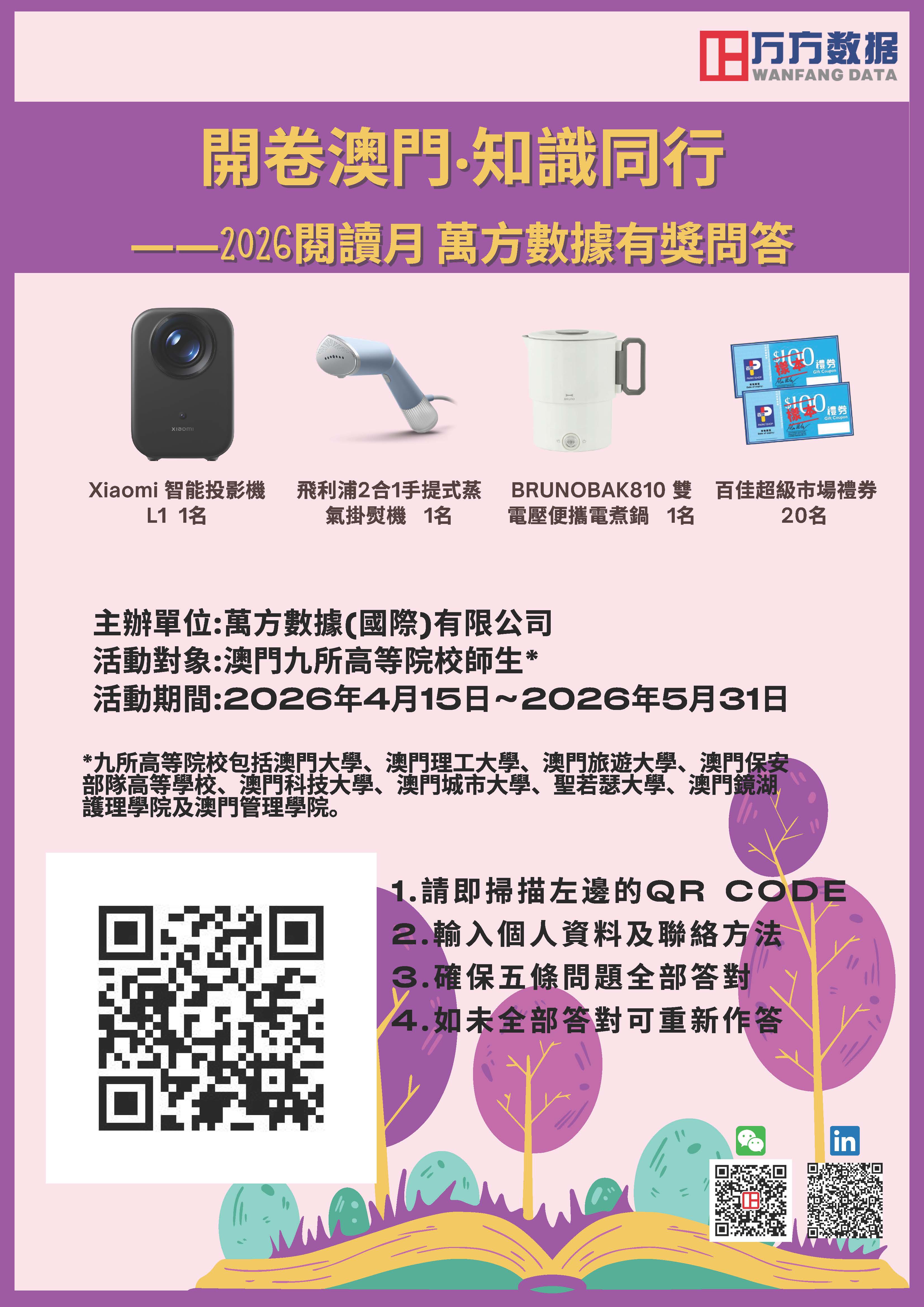 「開卷澳門 • 知識同行」2026閱讀月萬方數據有獎問答 由academic affairs發表於2026年 04月 14日(Tue) 15:28 Number of replies: 0 📢 為鼓勵師生善用學術資源,萬方數據(國際)有限公司推出了「開卷澳門 • 知識同行」2026閱讀月 萬方數據有獎問答活動 🎉 活動將於2026年4月15日至5月31日 舉行,只需掃描下方海報中的二維碼,即可輕鬆加入🔍答對全部題目即可參加抽獎!🏆 永久鏈接